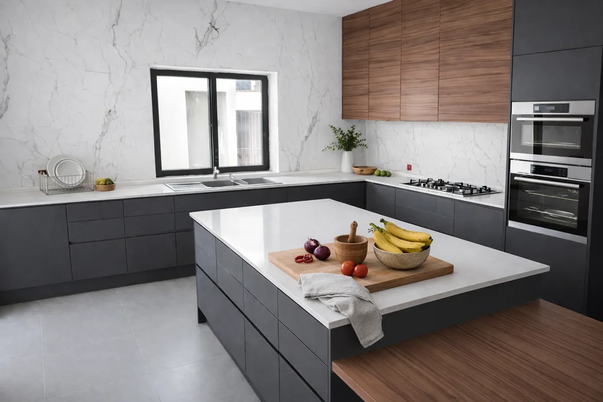 Conception complète d’une nouvelle cuisine avec mobilier sur mesure, plan de travail en quartz et finitions haut de gamme pour valoriser le bien à la revente.