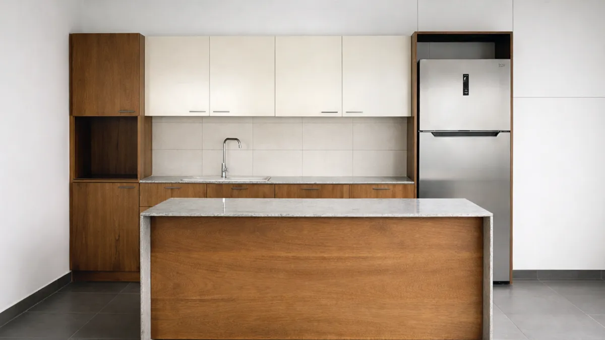 Cuisine modulaire complète avec ajout d’un îlot indépendant destiné à prolonger la surface utile et à renforcer le confort d’usage au quotidien. L’ensemble associait meubles hauts Beige Carat, meubles bas Iroko et plan de travail en granit Chiva White, pour une esthétique équilibrée, lumineuse et intemporelle