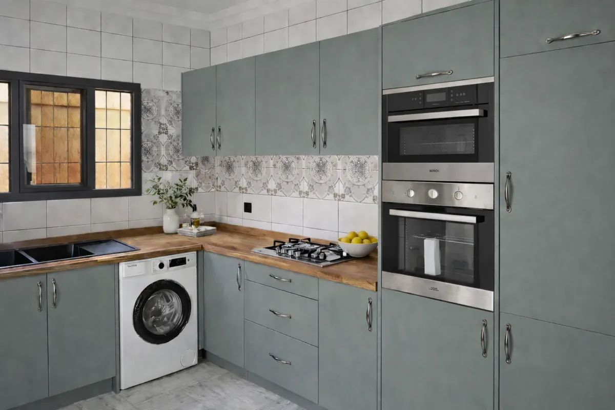 Cuisine modulaire complète repensée pour maximiser le rangement vertical tout en préservant l’équilibre architectural de la pièce. La composition intégrait des meubles hauts et bas en Vert Eucalyptus, associés à un plan de travail en bois massif de teck, pour apporter profondeur, chaleur et élégance à un projet où fonctionnalité et lumière devaient coexister avec justesse.