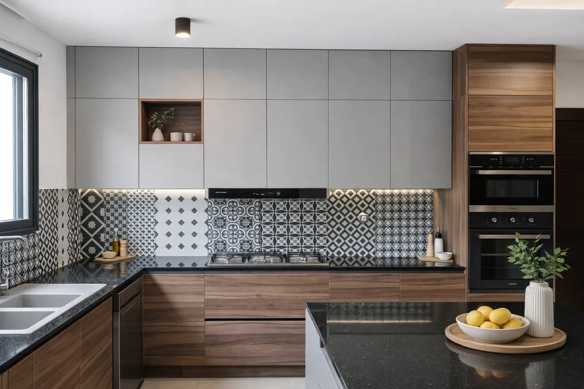Cuisine modulaire complète avec îlot central et extension repas intégrée, pensée pour conjuguer rangement, préparation et convivialité. Composition réalisée avec meubles hauts Gris Souris, meubles bas Noyer de Bourgogne naturel et plan de travail en granit Nero Galaxy noir, pour une écriture chaleureuse, élégante et durable.
